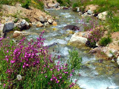 Der Wanderweg endet unweit nördlich vom Campingplatz. Nur noch wenige Schritte durch die vorgelagerte Blumenwiese mit unserem Hausbächlein und wir sind wieder auf dem Campingplatz zurück.